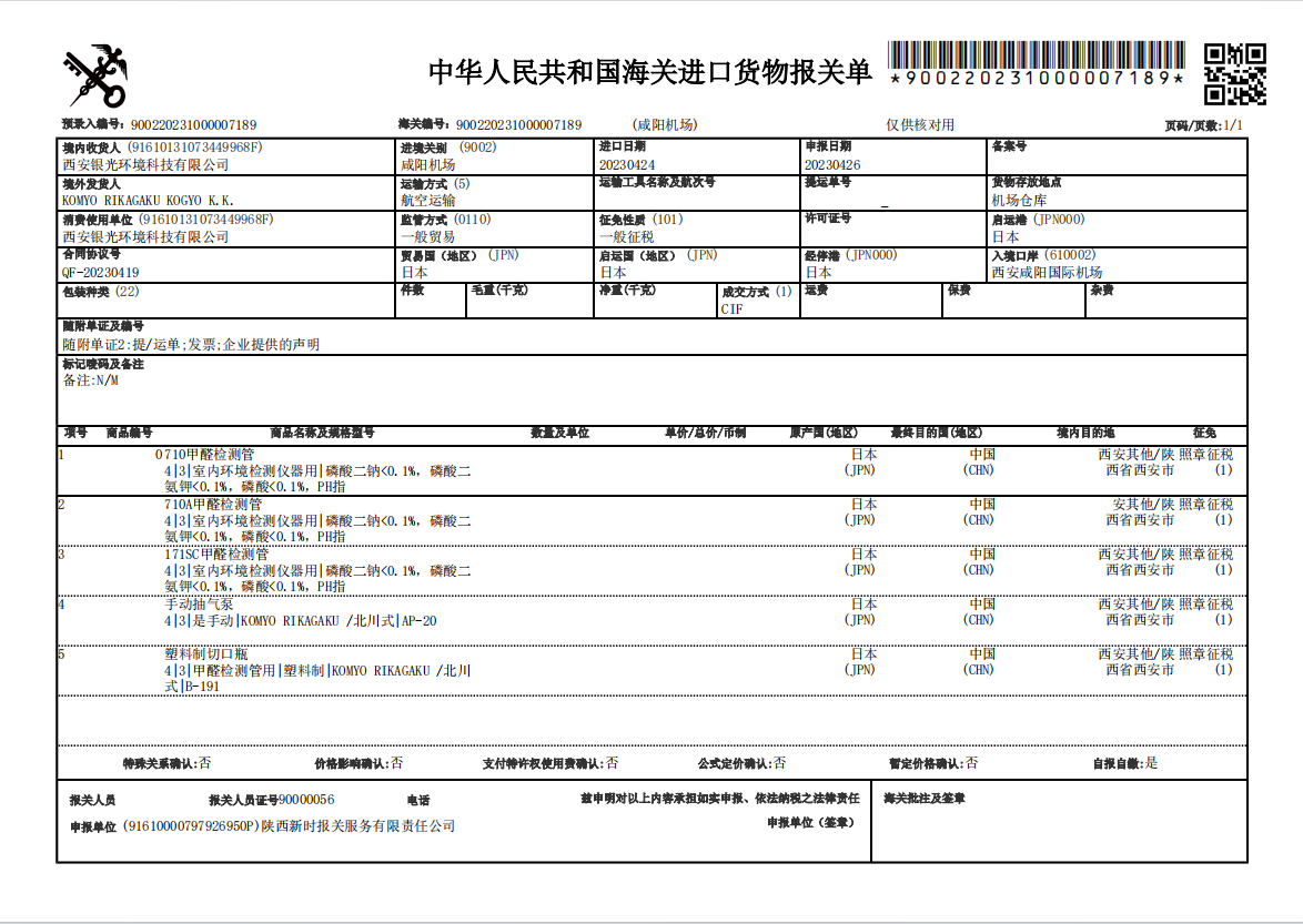 荃芬日本進口報關單憑據
