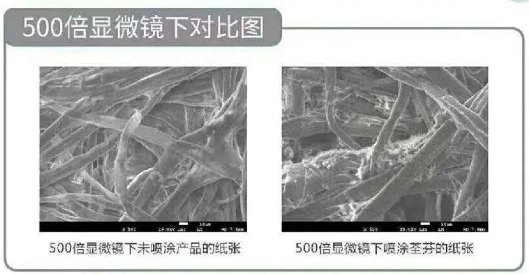 500倍顯微鏡下 紙張噴涂荃芬產品前后效果